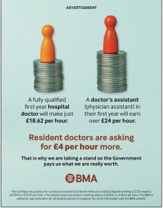 However a further element of anger and frustration must not be forgotten, as resident doctors see a process of replacing qualified doctors up to, and including consultant level in some areas, with less-qualified Physicians’ Assistants (PAs), Anaesthesia Associates and Advanced Clinical Practitioners who are all in theory “educated to master’s level or equivalent,” although a number of courses turn out to have less than convincing pass rates of 100%.