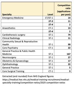 Across the whole spectrum of medical training the situation is even worse, and worsening. Data from the BMA shows 91,999 applications were made for 12,833 specialty training posts in England in 2025, resulting in an overall competition ratio of 7.17 applications per post.